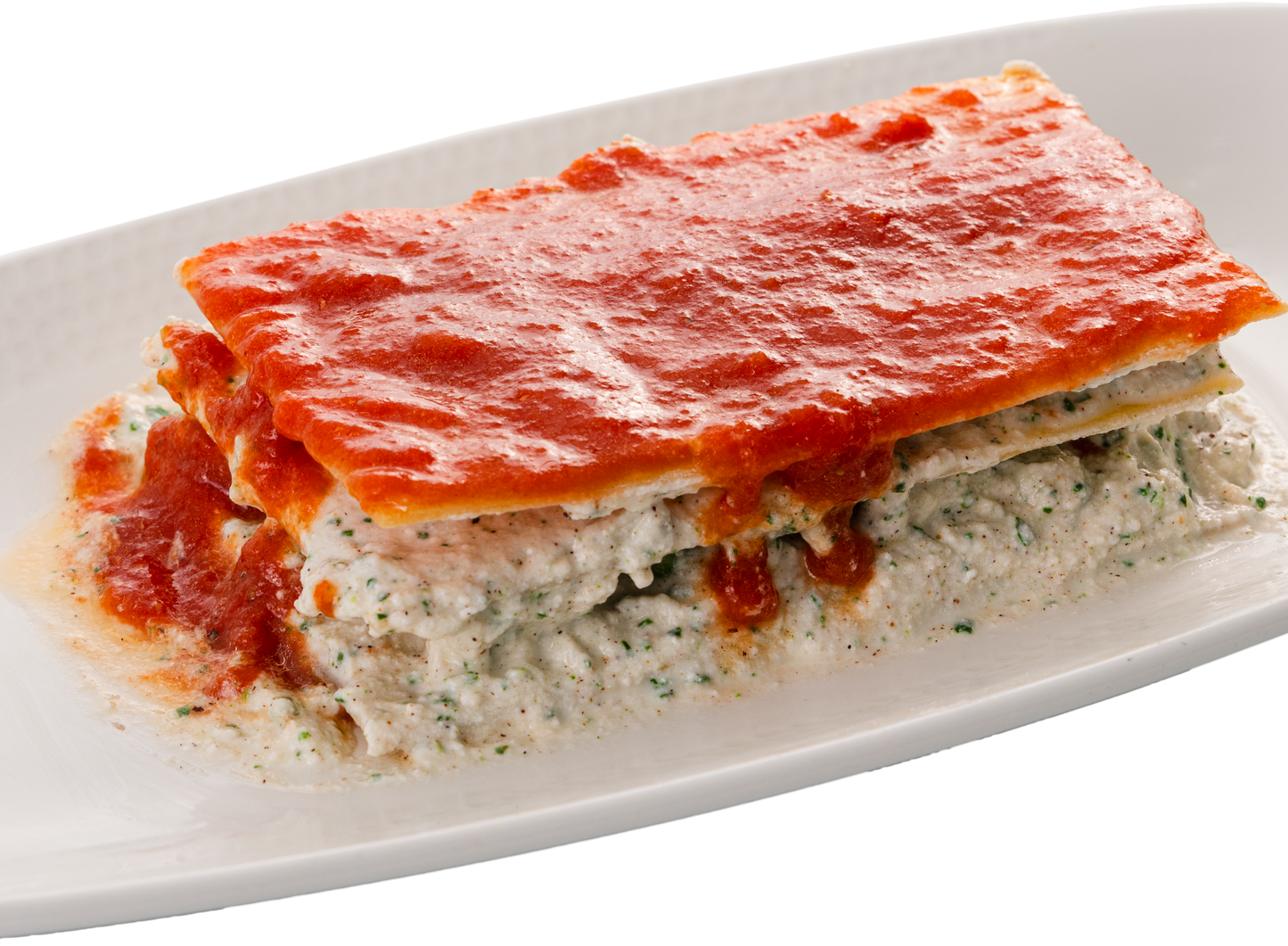Preparazione gastronomica cotta a base di pasta di farina di riso e farina di mais, besciamella e ripieno di ricotta e spinaci. Senza glutine.